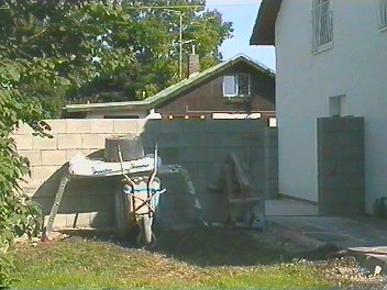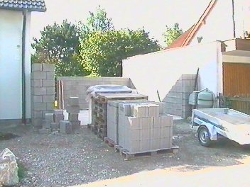 Da bauen wir eine schmale Wand, muß ja nicht isolieren (soll ja kein Wohnzimmer werden), so 17 cm, schmäler gibt's nicht. Und ein Dach aus Holz, das geht leicht zu verarbeiten und hält was aus. Nach überschlägiger Plaung sollten die Steine so 600 DM kosten, das Holz 300 DM, die Dachabdichtung 900 DM. Das Tor wäre das teuerste mit 3000 DM, also 4800 DM.